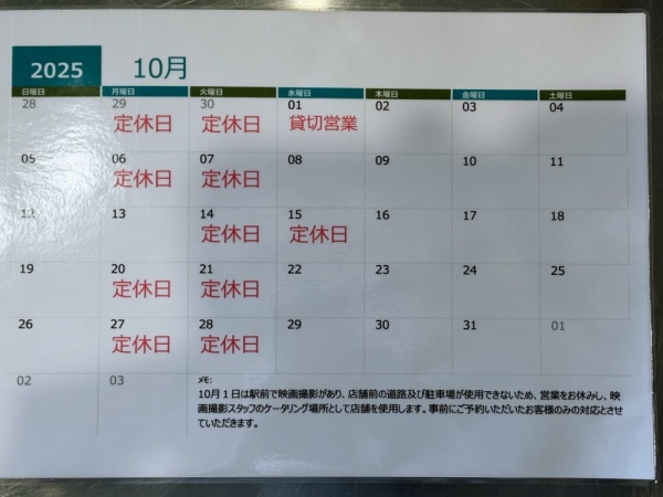 1日はお店の前の道路が、映画撮影のため通行止めになる為お店をお休みして、映画撮影スタッフのケータリングスペースとして店舗貸切営業とさせていただきます。 -
